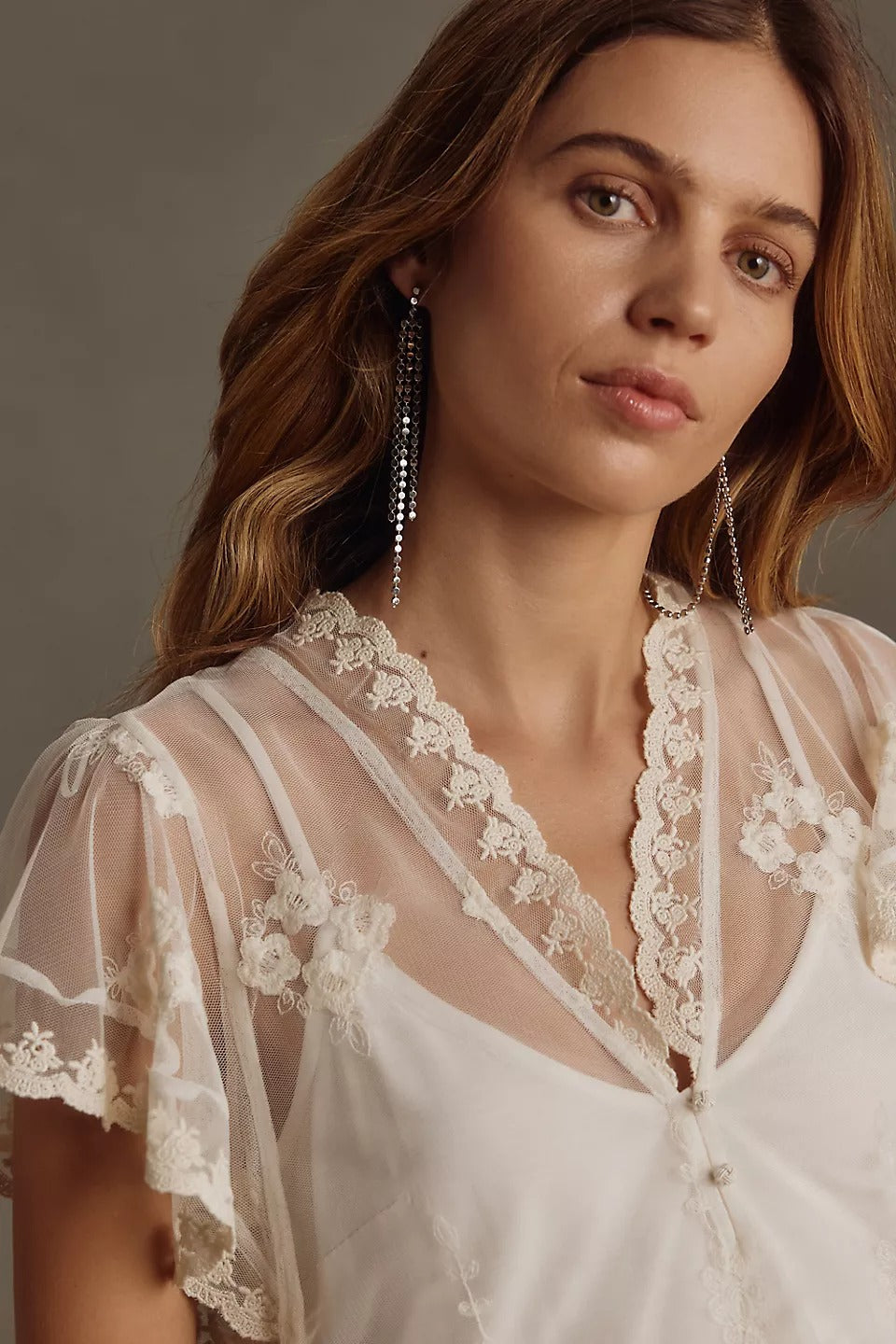By Anthropologie Flutter-Sleeve Embroidered Babydoll Blouse Top