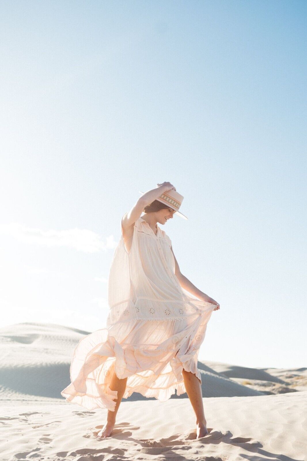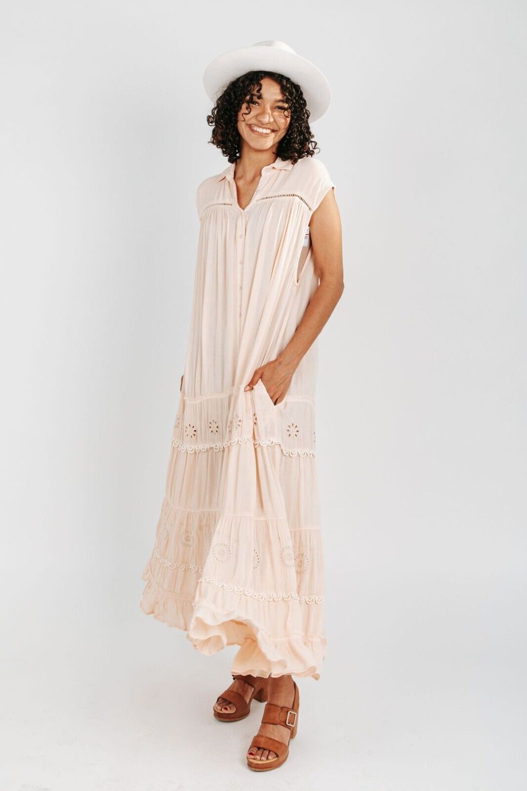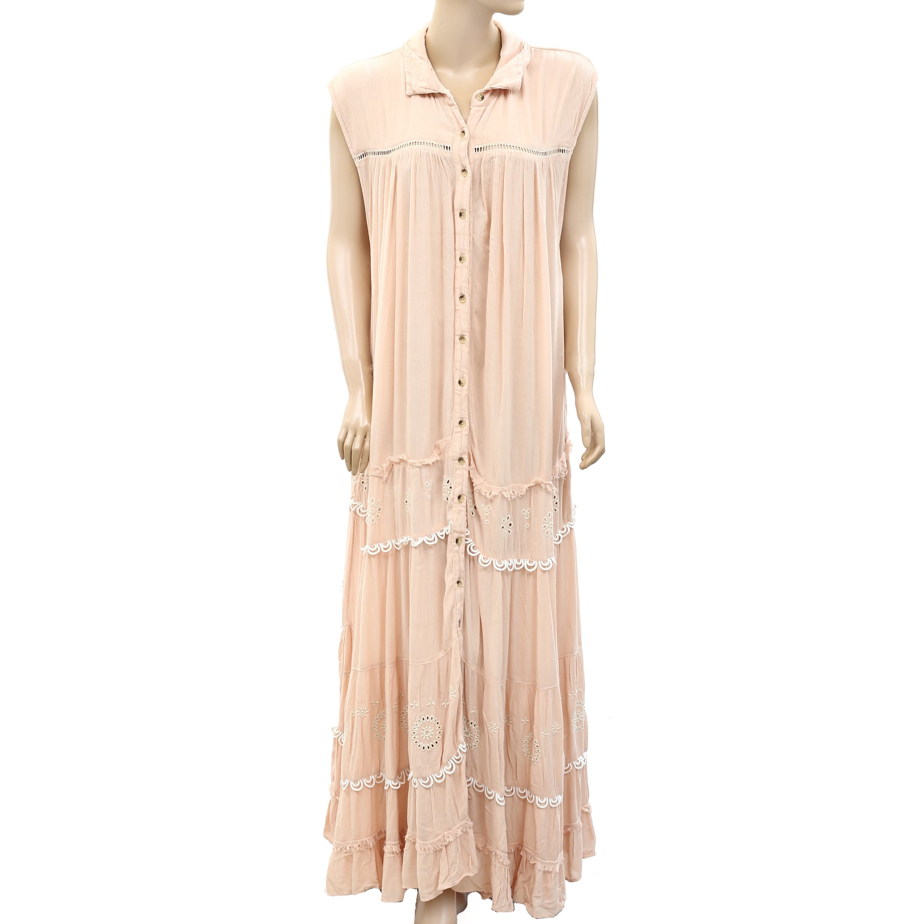 • button-front silhouette with tiered bottom detail and ladder lace inserting for added dimension.