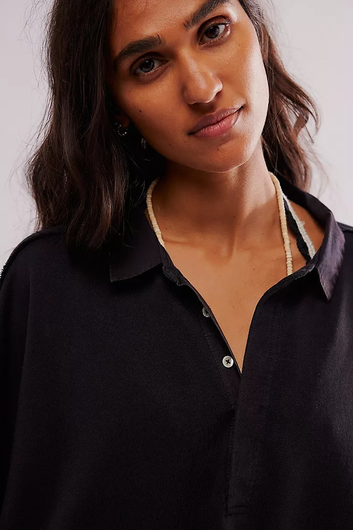 • collared-neckline with button placket,