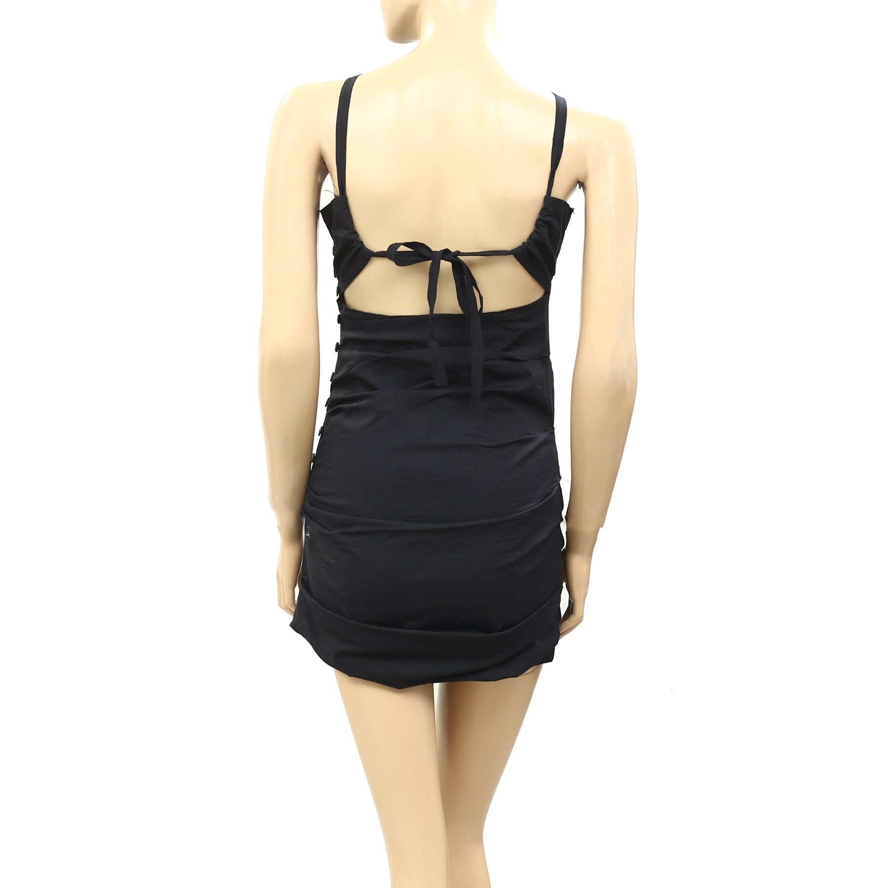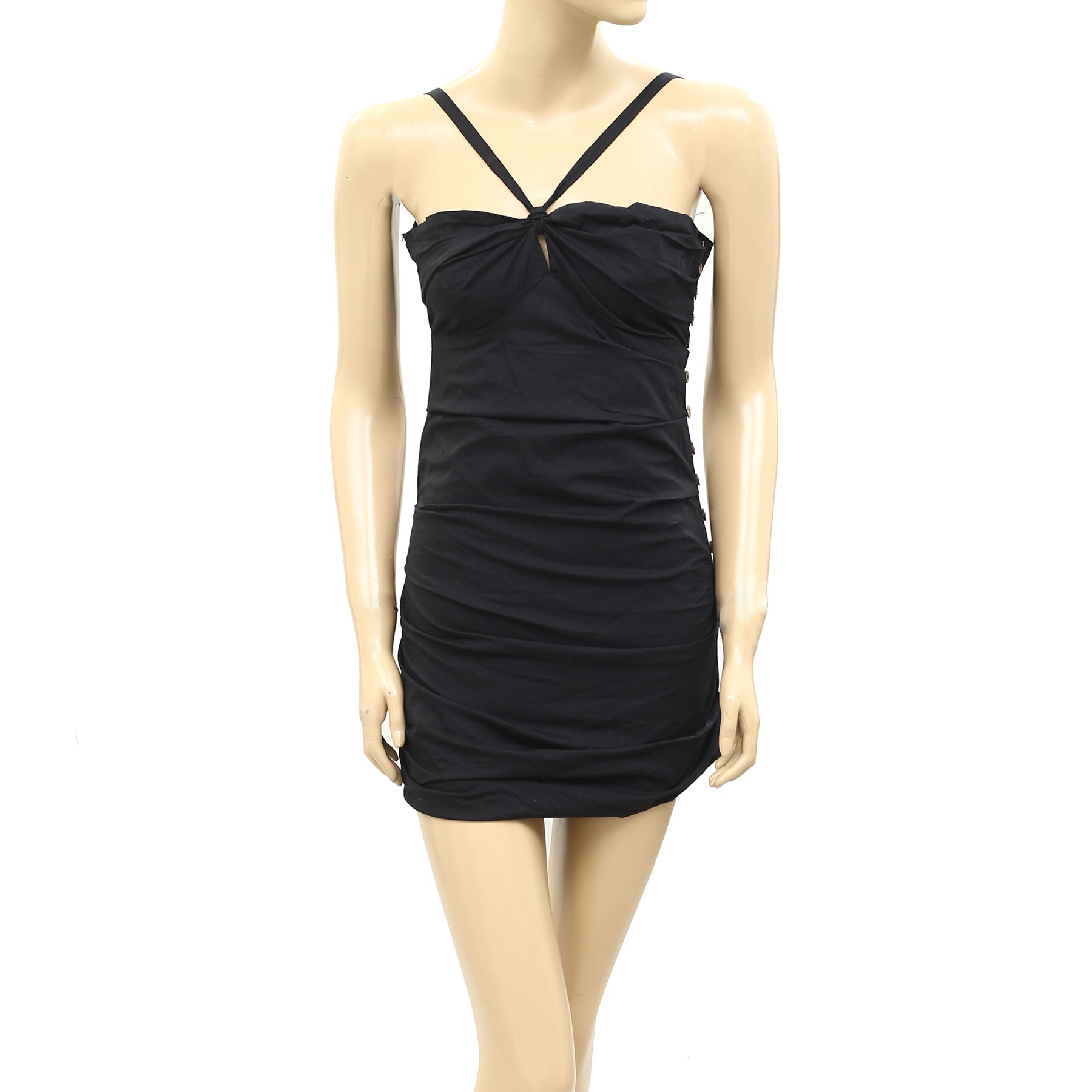 • Front keyhole cutout and statement button detailing at the side in a pleated.