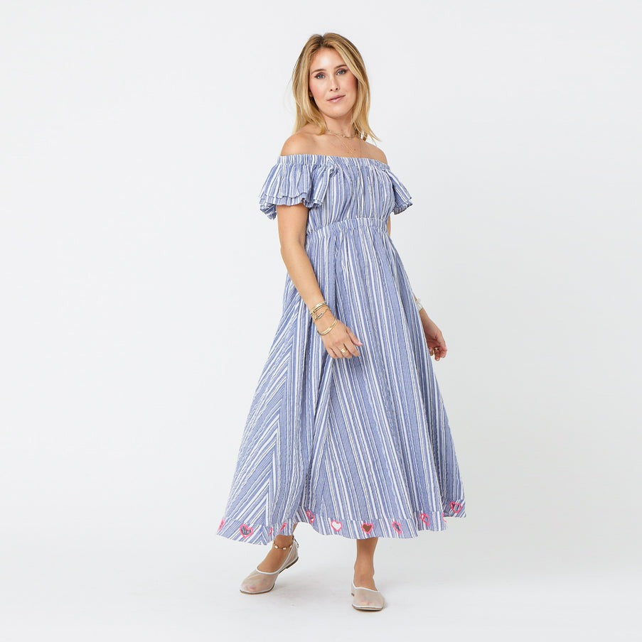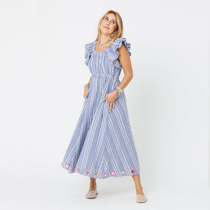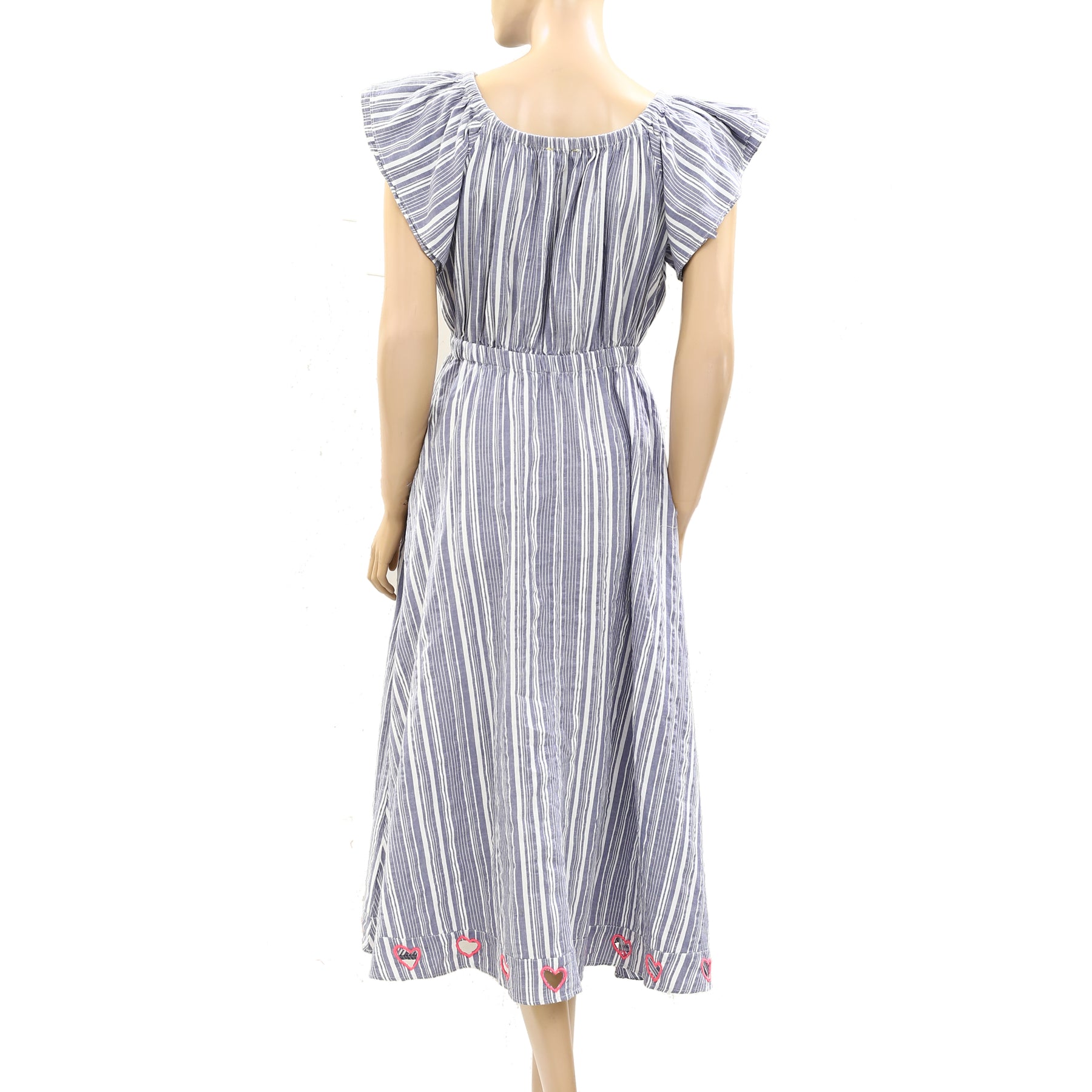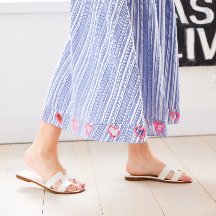 • Cut-out hearts at bottom hem, with pink embroidery